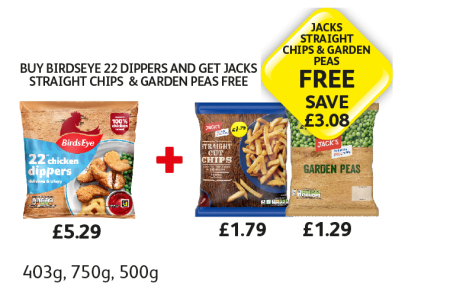 BirdsEye Chicken Dippers, Jack's Straight Cut Chips, Garden Peas - Buy Birdseye Dippers And Get Jacks Straight Chips & Garden Peas FREE at Londis