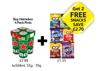 Heineken, KP Original, Thai Chilli, Dry Roasted, Discos Cheese & Onion, Salt & Vinegar, Pickled Onion - Get 2 FREE Snacks - Save £2.70 at Londis