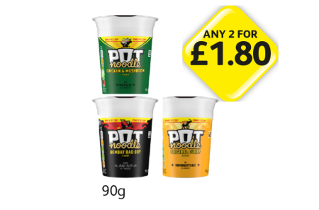 Pot Noodle Chicken & Mushroom, Bombay Bad Boy, Original Curry - Any 2 for £1.80 at Londis